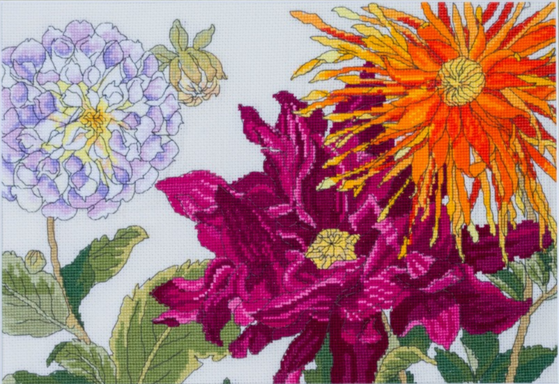 • Cross-stitch embroidery of colorful flowers, including a purple hydrangea, a bright orange sunflower, and pink dahlias, framed with a patterned wooden border and a green mat.